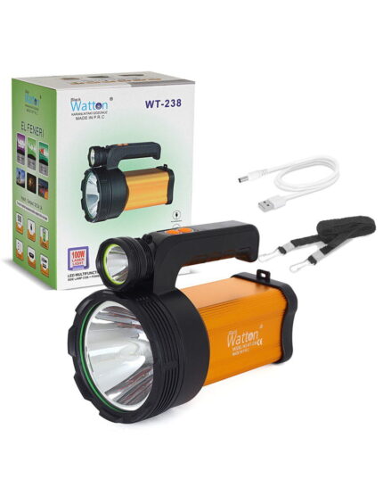 Watton WT-238, özellikle avcılık ve balıkçılık için geliştirilmiş, mavi ışık teknolojisine sahip yüksek performanslı bir el feneridir. 100 Watt gücü ve 44 SMD LED yapısı sayesinde geniş alanları net ve güçlü şekilde aydınlatır.
