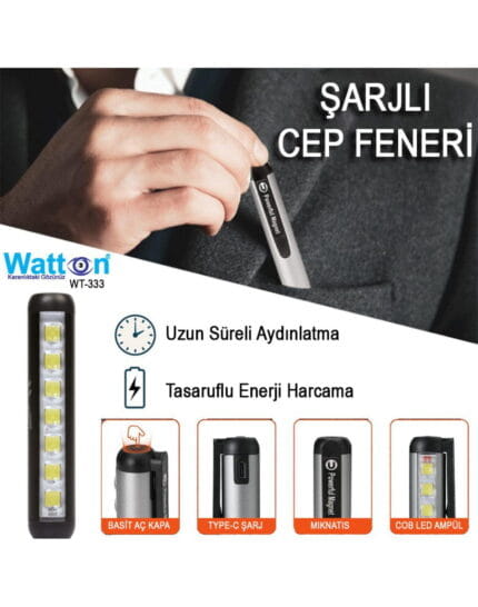 🔦 Type-C Girişli Mıknatıslı Şarjlı Cep Feneri Watton WT-333